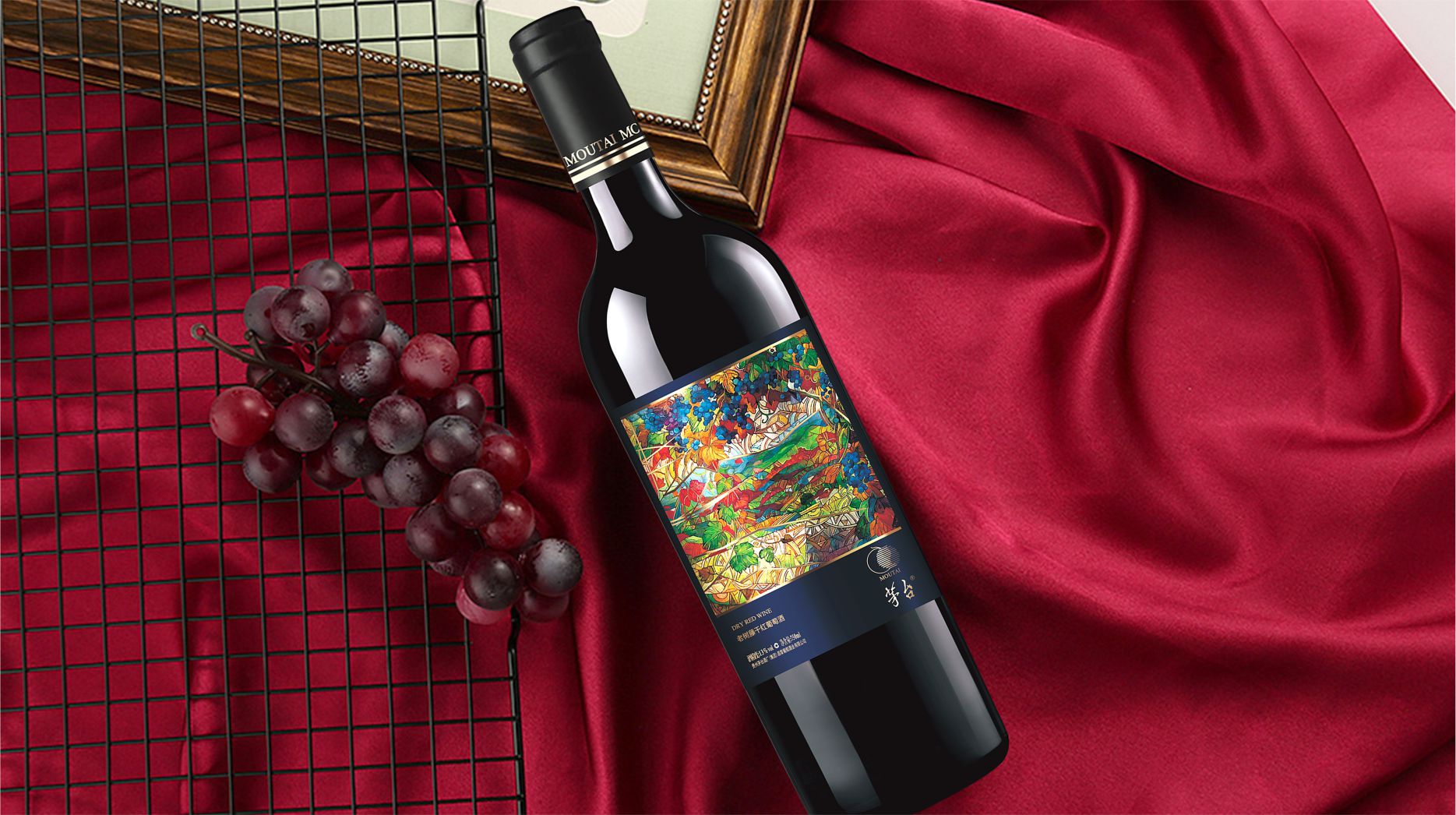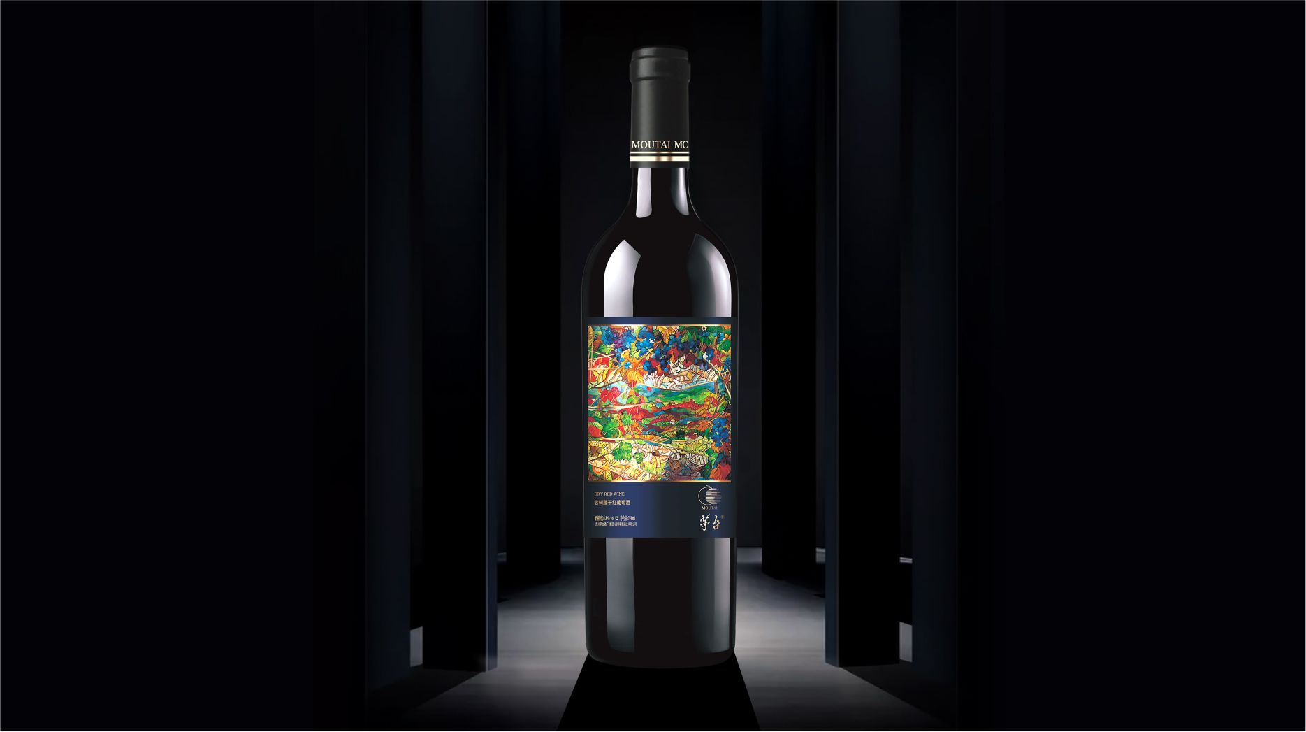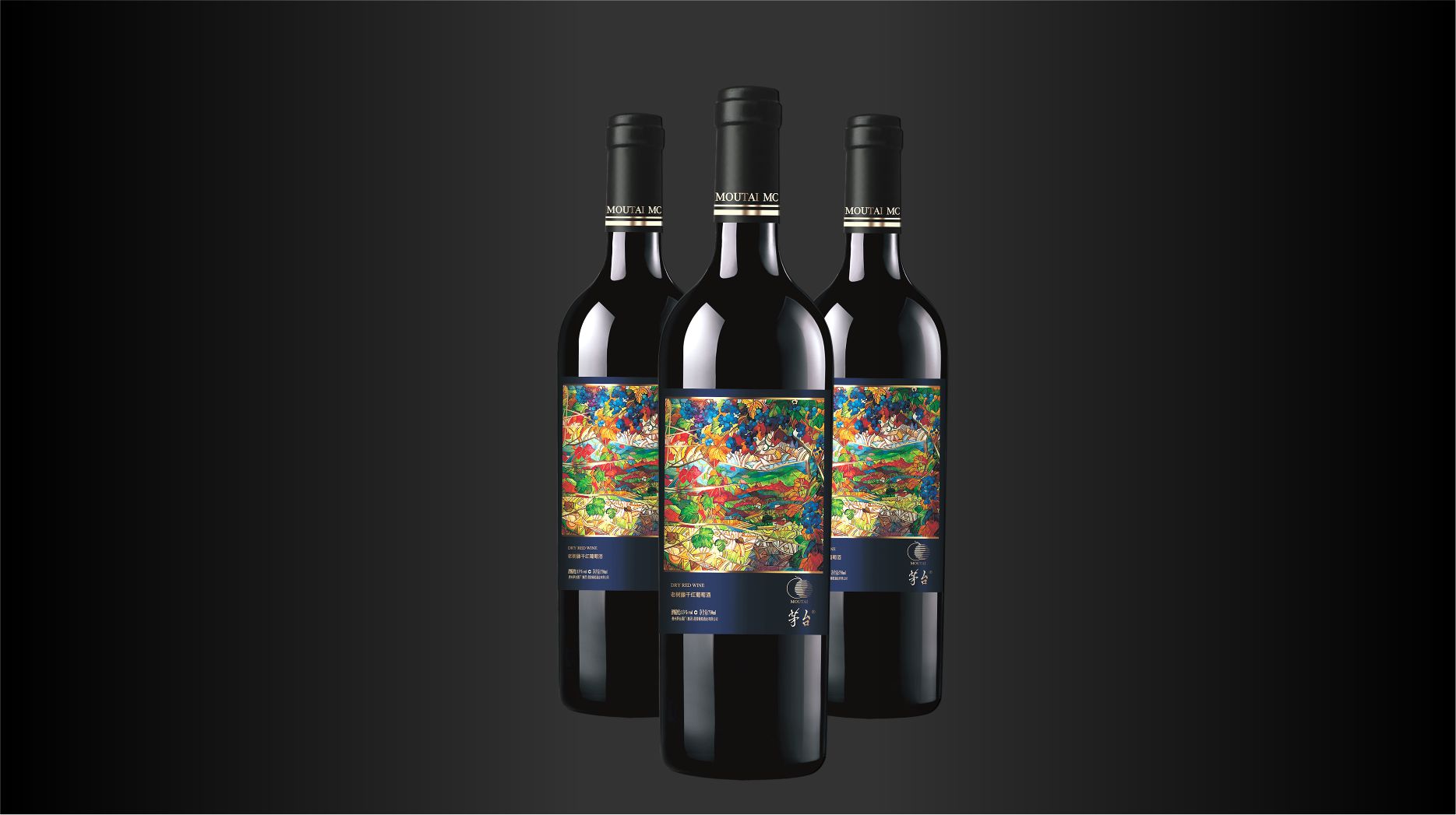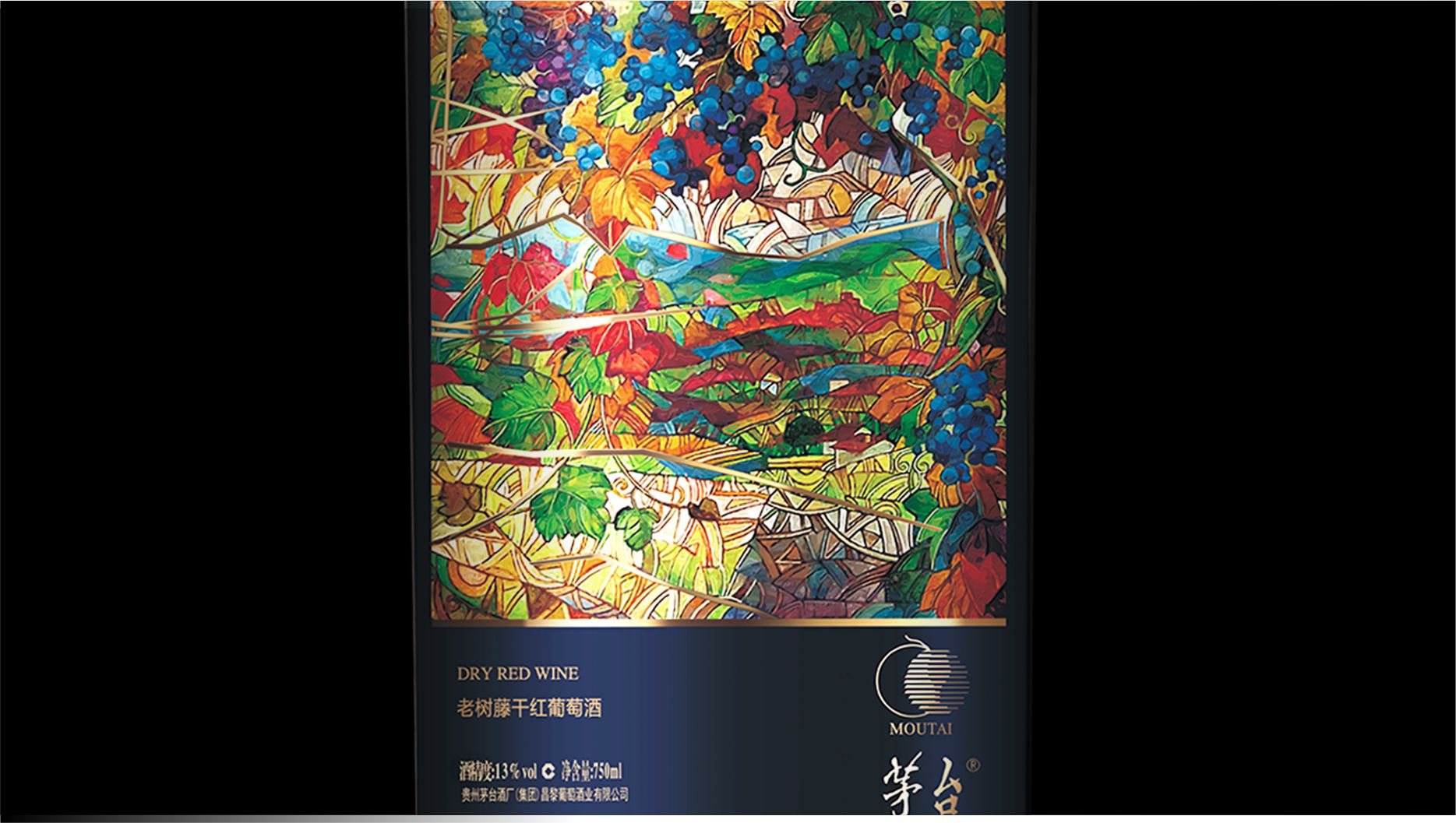此款紅酒的包裝設計采用了黑色、藍色和金色的搭配,給人一種高端、沉穩(wěn)和典雅的感覺。黑色的瓶身和瓶蓋與藍色的標簽形成了鮮明的對比,突出了標簽的視覺效果。標簽的中央是一個色彩繽紛的抽象圖案,富有藝術感和創(chuàng)意,象征著老樹藤系列產品的多樣風味和品質。標簽的上方是金色的“MAOTAI MC”的文字,體現(xiàn)了品牌的識別度和國際化的視野。標簽的下方是金色的“老樹藤干紅葡萄酒”和“DRY RED WINE”的文字,說明了此酒的品種,增加了產品的信息量和專業(yè)性。
