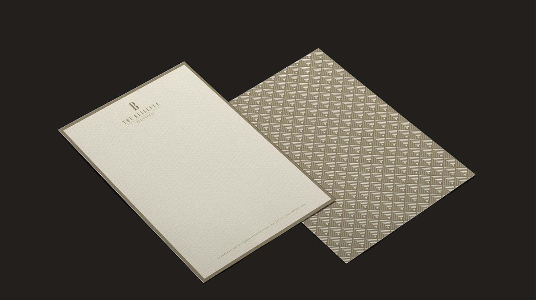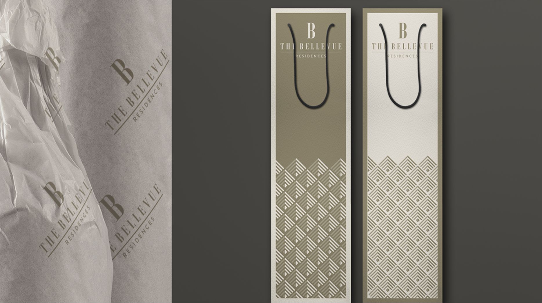 LOGO:這是一個簡潔而有力的設計,使用了一個襯線字體的大寫字母“B”,下面寫著“THE BELLEVUE”和“RESIDENCES”。LOGO的顏色采取暗金色,與酒店的整體風格相呼應,也象征著貴族和尊貴的氛圍。LOGO的整體形狀,給人一種穩(wěn)定和平衡的印象,也適合在各種媒介上使用。