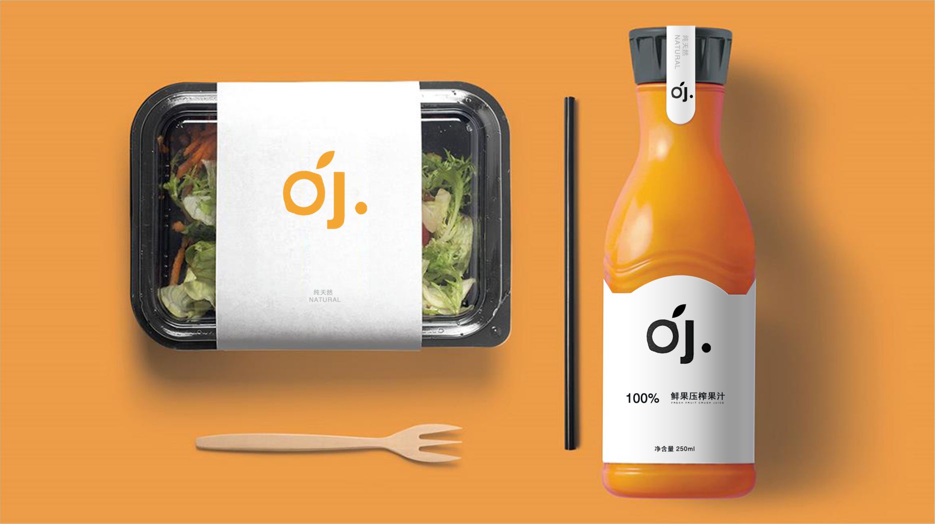 文字:這款包裝的文字設(shè)計(jì)也很有特點(diǎn),采用了英文和中文兩種語(yǔ)言,體現(xiàn)了品牌的國(guó)際化和本土化。品牌的名稱“OJ”是英文單詞“orange juice”的縮寫,簡(jiǎn)單而易記,也與品牌的標(biāo)志“oj.”相呼應(yīng),寓意著果汁的簡(jiǎn)單和純粹。品牌的標(biāo)語(yǔ)“100% natural orange juice”和“fresh natural salad”則突出了果汁的天然和新鮮,吸引消費(fèi)者的信任和喜愛。文字的字體也很簡(jiǎn)潔和現(xiàn)代,與包裝的風(fēng)格相協(xié)調(diào)。